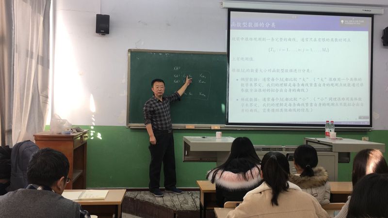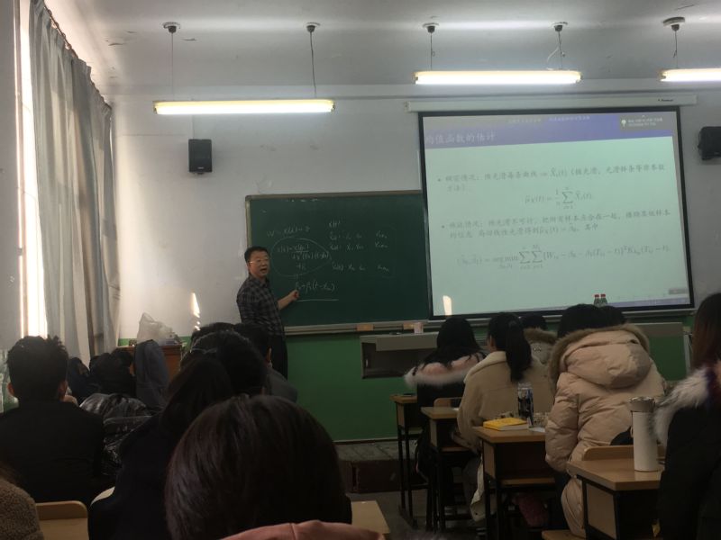 报告会中,张日权教授结合他多年的学习,教学和研究经验,向同学们介绍了函数型数据的概念。其中,张日权老师通过举心电图例子引入一维数据,又分别举例介绍二维及多维的概念。现实中很难观测到一条完整的曲线,只观测到的是集散的点。面板数据,纵向数据是函数型数据的特殊情况。函数型数据分成稠密数据和稀疏数据,并举出男女孩身高增长图作为实例。首先,对函数型数据分情况进行估计,并运用主成分方法对无限维进行降维成有限维,得出函数型主成分得分。接下来,张老师又对函数型数据进行回归模型的估计,分成四大类进行讲解,并对模型进行检验。最后,beat365在线唯一官网登录的老师和同学们与张日权老师进行了互动,同学们及时提出了自己的疑惑,张日权老师也对同学们提出的问题进行了详细的解答,又为同学们在这个方向上的学习给出了指导性的建议。并激励同学们要担负起数学与统计人才应有的使命,为我国的数学与统计学建设作出应有的贡献,也希望大家能够脚踏实地的学习理论知识,为数学与统计学的发展不懈努力。
