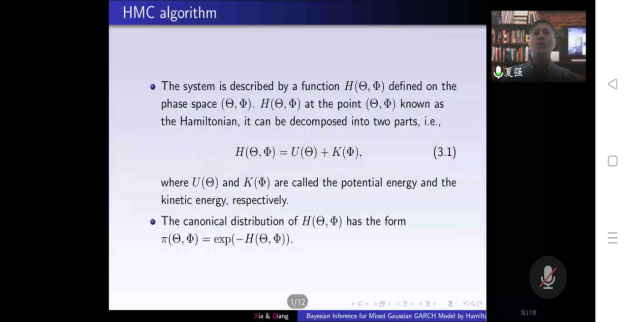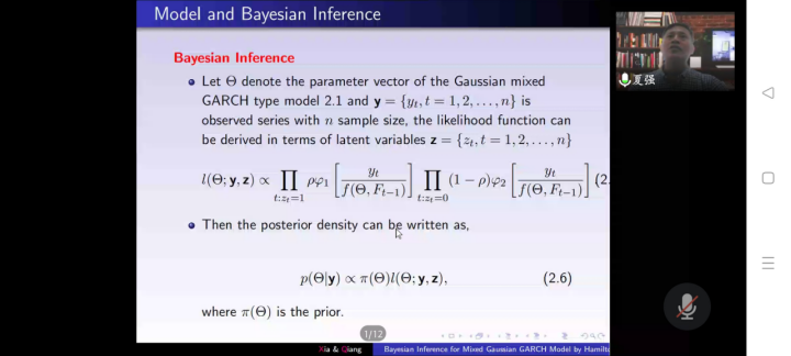 报告会中,华南农业大学夏强教授首先讲解了一种易于执行且能有效地从后验分布中提取样本的哈密顿蒙特卡罗(Hamiltonian Monte Carlo, HMC)算法来估计高斯混合GARCH模型。然后,在贝叶斯估计的基础上,研究了高斯混合GARCH模型的预测方法。通过仿真实验,HMC算法比Griddy-Gibbs采样器更快、更灵活。最后给出了一个实际应用讲解,验证了该算法的有效性。使大家对于HMC算法的高效性有了更加深入的了解和兴趣。
