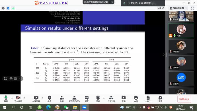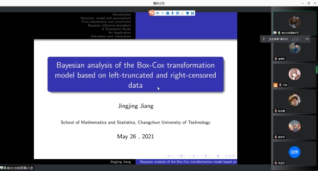 报告会中,蒋京京博士首先指出讨论Box-Cox转换模型的推理问题时面临left-truncated和right-censored数据, 比如横断面抽样方案。然后,指出Box-Cox转换模型包含了许多常用的模型,如比例风险模型和加性风险模型等特殊情况。随后,提出了一种贝叶斯估计方法,该方法采用分段函数逼近基线风险函数。同时,利用边缘部分不受约束的条件边缘先验来解决参数约束带来的计算难题,并提出了一种MCMC抽样方法。最后对所提方法进行了有限样本性能的仿真研究,结果表明该方法适用于实际情况。使大家对于Box-Cox算法及贝叶斯估计有了更加深入的了解和兴趣。