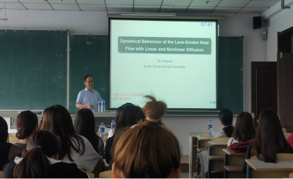 报告会中,尹景学教授先向大家讲解了动力学方程,进一步向大家展示了线性和非线性扩散的Lane-Emden热流。最后探讨了其解的动力学行为,包括解的周期性、渐近性的复杂性和解的混沌性等。使大家对于线性和非线性扩散的Lane-Emden热流的动力学行为有了更加深入的了解和兴趣。