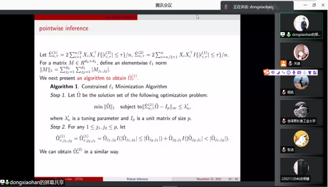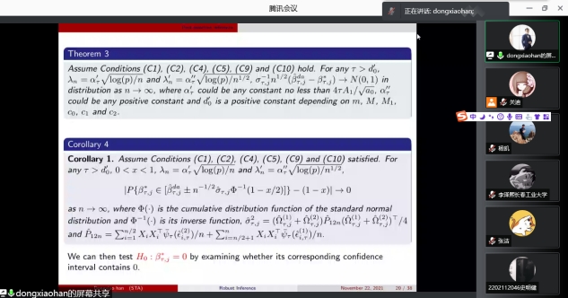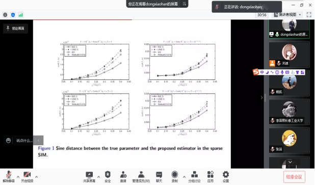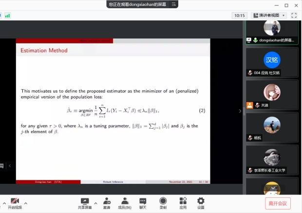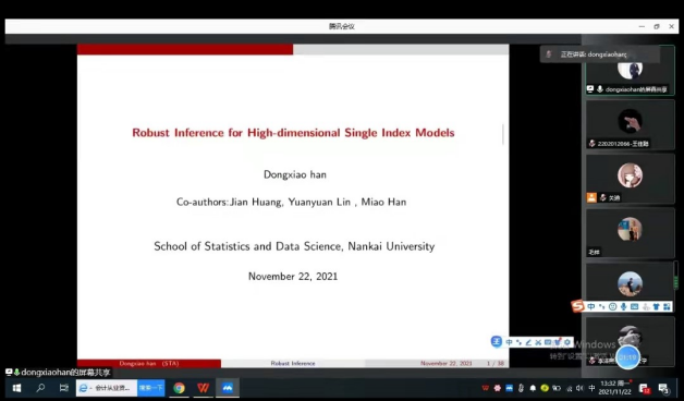 2021年11月22日下午13:30我院特邀南开大学韩东啸教授做线上学术报告,报告由统计系主任杨凯老师主持,学院部分老师、全体研究生参加了本次线上学术报告会。