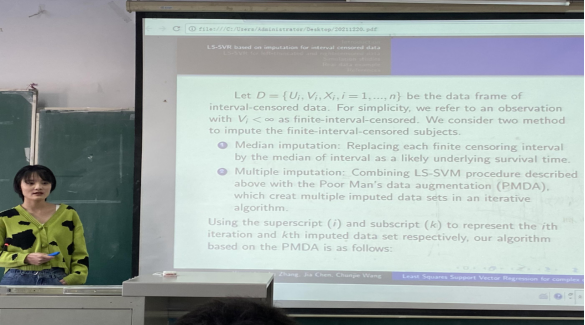 会议过程中,刘新蕊同学以其清晰的思路和严谨的思维行云流水地向硕士研究生们展示了其论文的主要思想和研究过程,即为了克服回归估计时的困难响应服从区间截尾或左截尾和右截尾,提出了最小二乘支持向量回归(LS-SVR)算法和一种加权算法关于最小二乘支持向量回归程序。通过统计方法研究,其论文模拟结果表明,所提出的方法能有效地减少回归误差。刘新蕊同学最终通过各个领域的实际数据验证了其研究的泛化能力,为今后类似的数理统计研究提供了很好的思路。