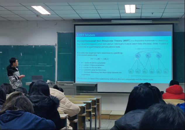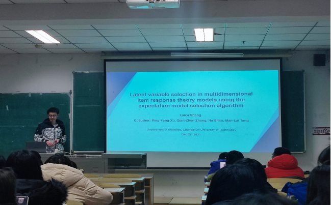 报告过程中,尚来旭同学首先生动形象地向大家展示了文章的4个主要贡献:1.提出MIRT模型的EMS的一般流程。2.证明在温和假设下EMS的数值收敛性3.证明EMS对M2PL模型的收敛性。4.加快计算速度。其次讲解了MIRT是描述测试项目与个体多重潜在特征之间相互作用的理论框架。它在心理和教育测试中起着核心作用。介绍了多维双参数Logistic模型、MIRT模型中的潜在变量选择使用EMS算法,EM算法用来求解最大化问题,用BIC准则选最优参数。最后通过最小化观测BIC证明了EMS算法在模型选择方面的数值收敛性。在可辨识性假设下,验证了EMS算法在多维二参数logistic (M2PL)模型中潜在变量选择的收敛性。为M2PL模型提供了一个有效的EMS实现。仿真研究表明,该方法在正确选择潜在变量和计算时间方面优于基于EM的L1正则化方法。