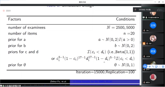 在这个特别的日子里,付志慧教授全面系统地给我们分享了四参数Logistic模型的Gibbs抽样方法。主要讲解模拟研究、实际案例部分,引发了同学们浓厚的学习兴趣。一方面巩固了同学们关于抽样方面的知识,另一方面让同学们对此方向的学习有了更明确的思路以及规划。在报告尾端,老师同学们和付志慧教授针对报告的内容展开了激烈的探讨。在场师生均表示聆听本次报告受益匪浅,收获颇多。