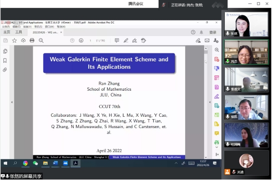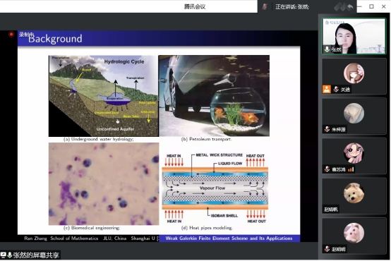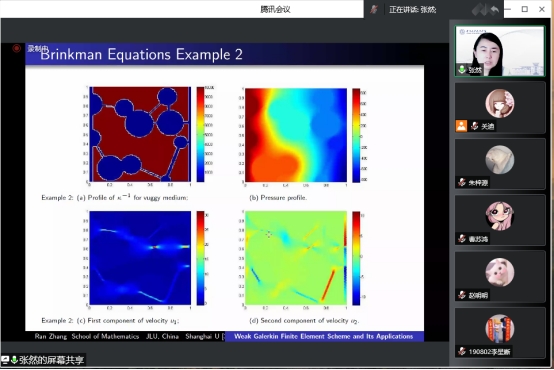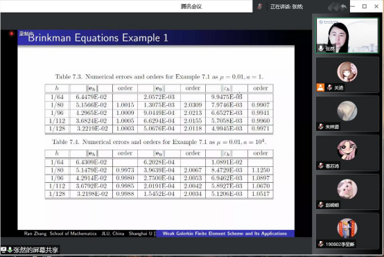 报告会伊始,张然教授向我们分享了吉林大学数学学院近十年来在计算数学方向发展过程中的经验教训和成果。而后具体讲解了在弱有限元方法上的重大成果,解释了弱算子、稳定子的概念,并用几个例子具体讲解了弱有限元方法的特点。在此基础上,张然教授对正则性的函数像延伸到边界该如何解决,提出了在