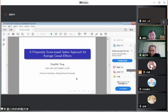 报告中,童行伟教授通过现实中的实际例子,例如注射新冠疫苗和打太极的产生的效果等,生动形象地向我们讲解了因果推断的相关概念与研究内容。童行伟教授还介绍了一种基于倾向得分的使用B样条的新半参数估计策略,该策略不依赖于参数模型规范。通过解决误差异方差性进一步提高了估计器的效率,还建立了两个估计量的渐近性质。模拟研究表明,该方法与许多竞争估计器相比具有优势且优于加权估计器,因为它不受极端权重的影响。该方法应用于2012年俄亥俄州医疗补助评估调查(OMAS)的数据,估计了医疗保险对根据“平价医疗法案”选择补贴保险计划的人群自我报告的健康状况的影响。
