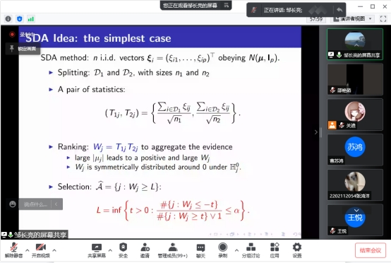 邹长亮教授通过一个简单的例子对SDA的具体实施步骤进行了细致的讲解,证明SDA方法比基于渐近p值的方法更具鲁棒性。报告会结束后,大家对基于一般依赖的错误发现率控制问题产生了浓厚的兴趣,老师及同学向邹长亮教授踊跃提问交流,其中李教授针对同学提出的如何将SDA方法扩展到FDP问题做出耐心解答,并进行了细致的阐述,拓展了老师和同学们表示在该方面得到了前所未有的启发,激发了同学们的学习热情,为接下来的科研工作积攒了宝贵经验,为我们接下来的工作开启了新思路。