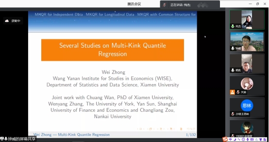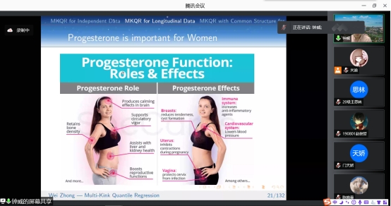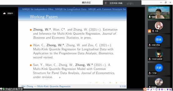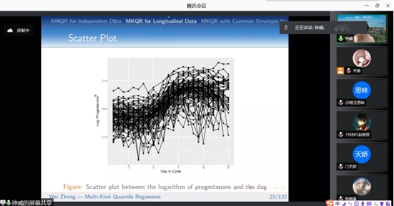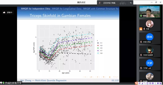 在报告中,钟威教授从Independent Data,Longitudinal Data以及Common Structure for Panel Data这三种类型的数据出发,详细分析多折点分位数回归问题。并且以肱三头肌皮脂厚度和女性孕酮数据为例对MKQR模型以及应用问题进行了介绍。此模型的应用不仅允许有多个折点,还可以根据数据选择折点。在非参数估计中介绍了两种解决方法:一种是核估计方法,另一种则为样条方法。讲解方式深入浅出,不仅让师生充分了解了MKQR模型,也激发了同学们对此研究方向浓厚的学习兴趣。