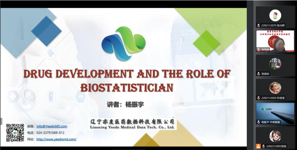 (通讯员:杨凯)2022年12月1日下午15:00,我院特邀辽宁亦度医药数据科技有限公司总经理杨振宇做题为《Drug development and the role of Biostatistician(创新药物研发及生物统计师所处角色)》的报告。报告由学院副院长李纯净主持,统计主任杨凯、统计系支部书记袁晓惠,以及统计系胡茜等青年教师以及2020级、2019级本科生以及研究生参加了本次线上报告。