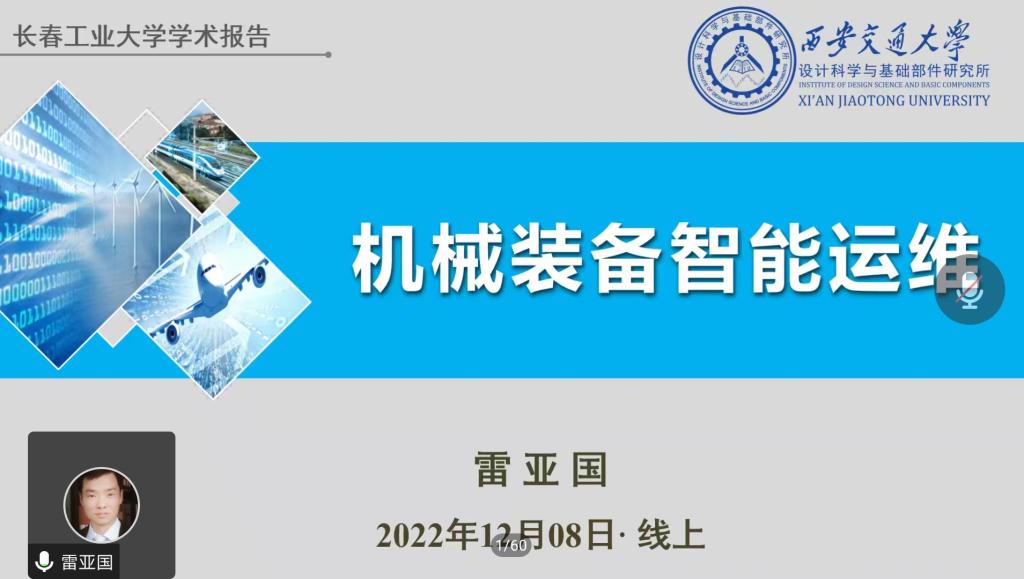 (通讯员:关迪)为丰富学生的学习生活,提高学生的综合能力,2022年12月8日下午19:30,由科研处和beat365在线唯一官网登录承办的“机械装备智能运维”在腾讯会议线上举行,特邀西安交通大学雷亚国教授做报告,为beat365师生进行讲解,beat365在线唯一官网登录院长王纯杰、副院长李纯净、统计系主任杨凯、学院部分老师,本科及研究生共215人参加本次线上学术报告,报告由院长王纯杰主持。
