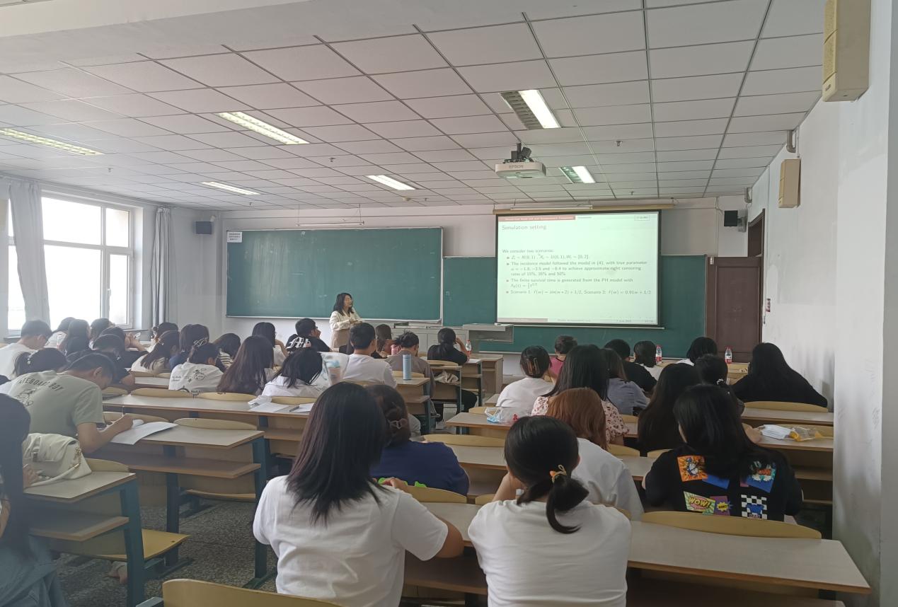 在接下来的报告中,刘晓玉教授围绕“Mixture Cure Model with both Semiparametric Components for Interval-Censored Data”开始讲解,通过生存分析删失数据、线性和非线性协变量、左删失、区间删失、右删失等方面进行知识讲解,用通俗易懂的语言与生活等其他方面都进行了联系与结合,由浅入深地向同学们讲解相关知识,使枯燥的知识变得有意思起来。