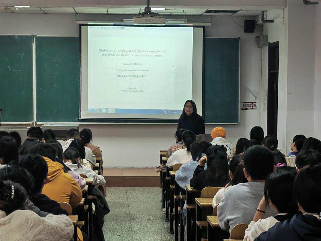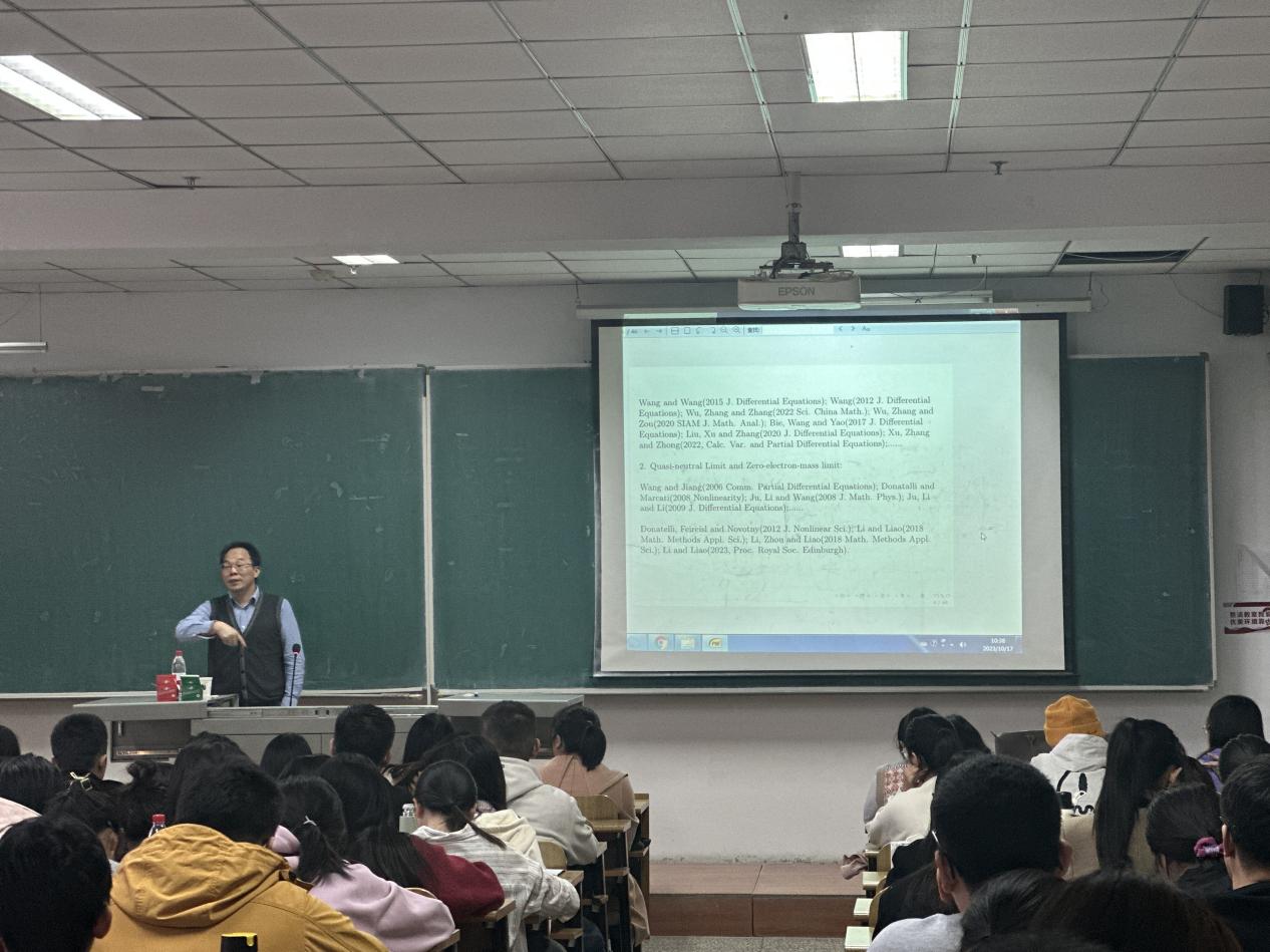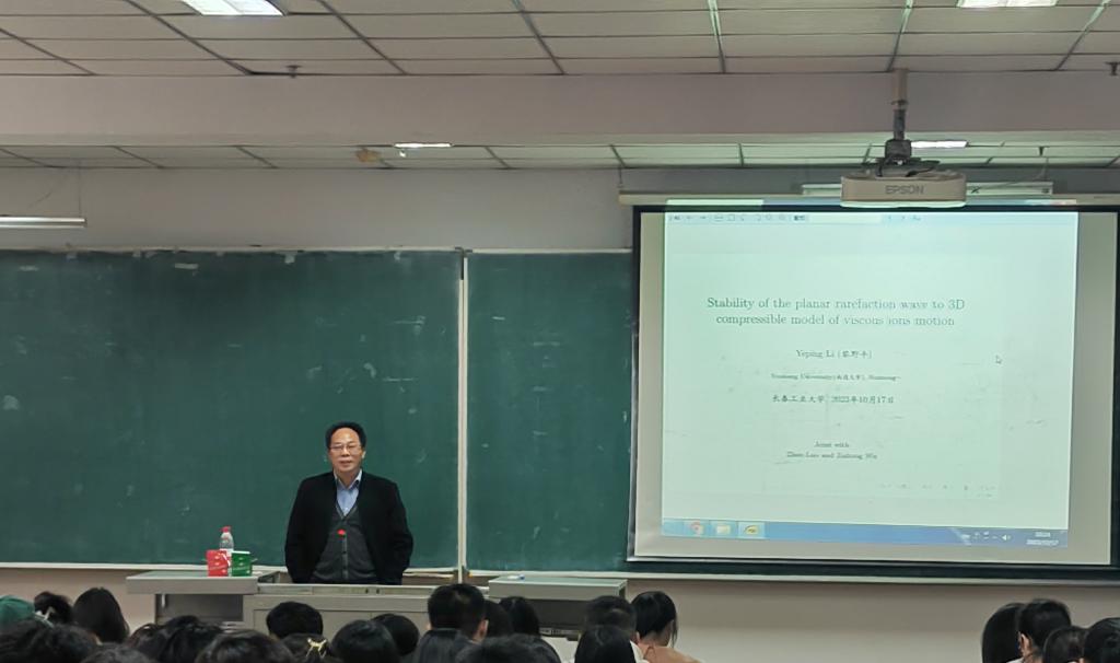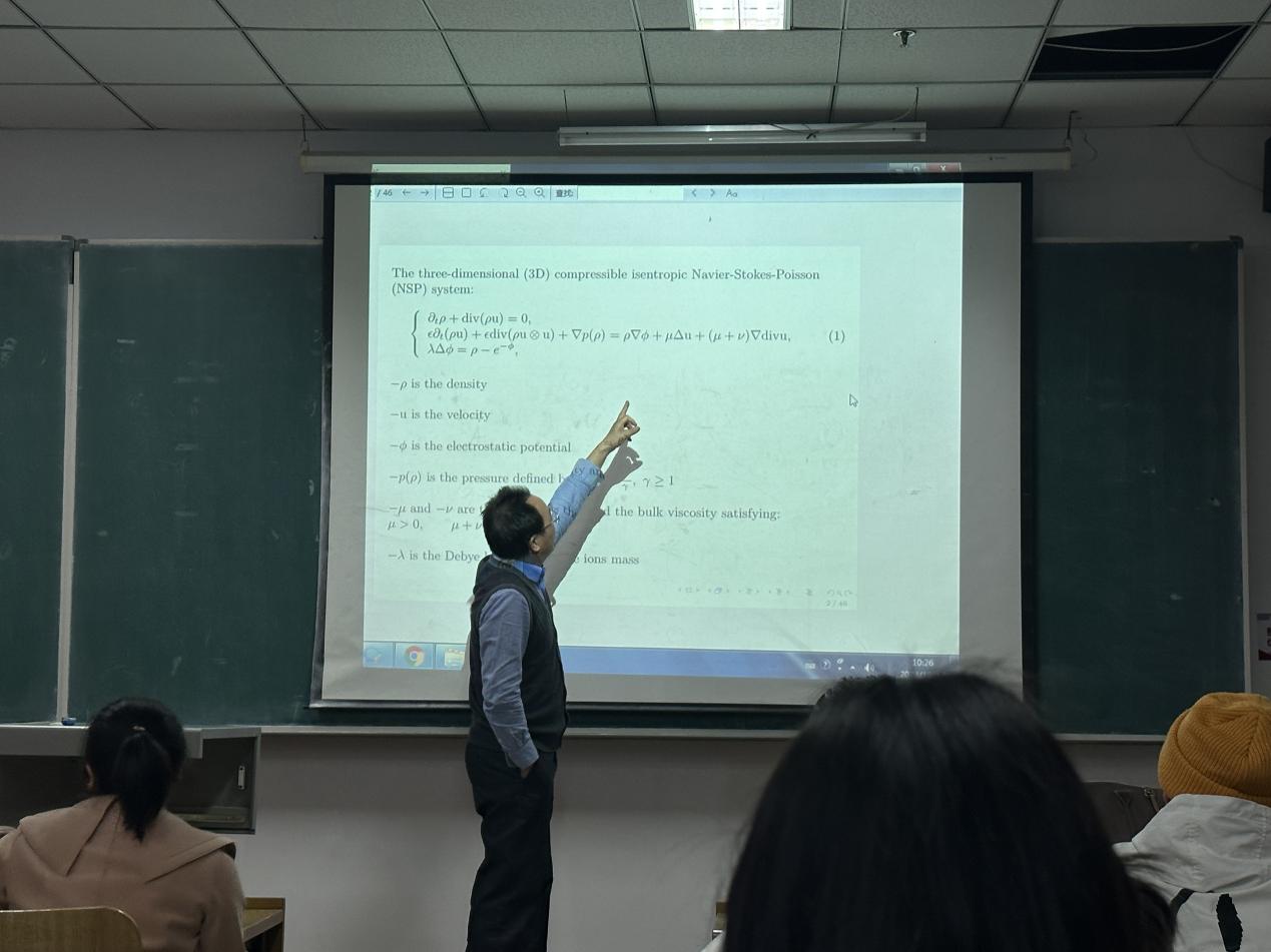 在接下来的报告中,黎野平教授以“平面稀释波对粘性离子运动三维可压缩模型的稳定性”为主题,从偏微分方程讲起,介绍了三维可压缩等熵系统中的重要公式及参数含义。在报告过程中,鼓励同学们把基础知识打牢,并且把数学知识引入生活中,用通俗易懂的语言让同学们对公式有了更加准确的认识。