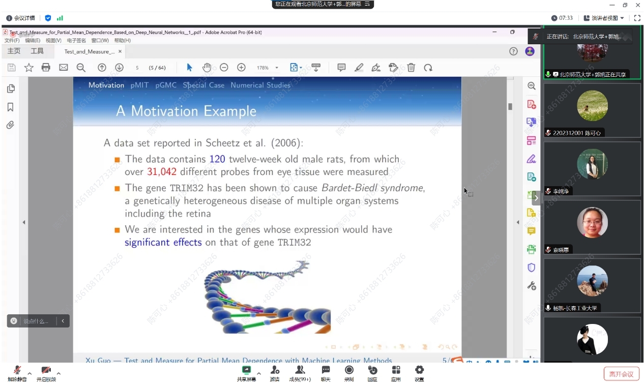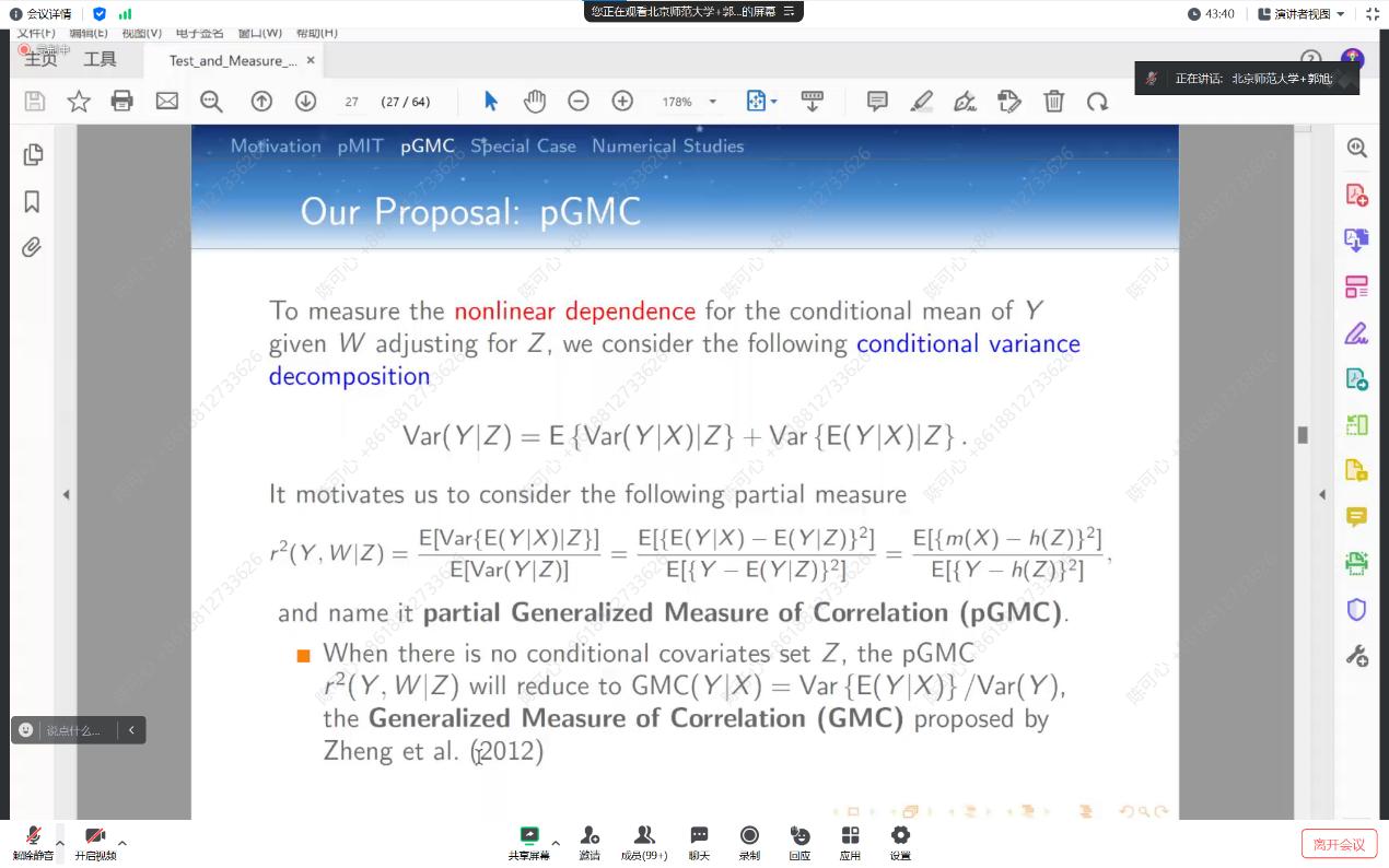 此外,报告还讨论了功率增强和算法稳定性问题。如果拒绝了零假设,报告提出了部分广义相关测量(pGMC),在控制了Z的非线性影响后,测量给定W的Y的部分均值依赖性。提出了 pGMC 的吸引人的理论特性,并建立了其估计值的渐近正态性和最优 N 根收敛率。作为一种重要的特殊情况,当不存在条件协变量 Z 时,引入了一种新的检验方法,即在无模型环境中检验协变量对响应的总体显著性。郭老师团队还进行了数值研究和实际数据分析,以与现有方法进行比较,并证明所提出的程序的有效性和灵活性。
