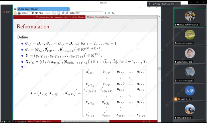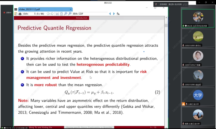 涂云东教授在本次研究中,提出了一种具有多阈值的分位数回归预测算法,以捕捉股票收益预测中潜在的区制转换机制。涂教授从平均回归预测开始讲起,详细了讲述了平均回归预测的理论和公式,然后引入分位数回归预测基础理论,并且详细解释了为什么收益的可预测性较弱等问题。