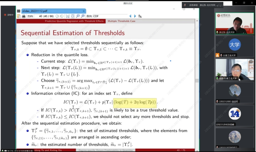 在接下来的讲解中,涂云东教授为我们介绍了分位数回归预测的性质,每个预测子的可预测性可以根据阈值变量的值从一种状态切换到另一种状态,并且可以在分位数之间变化,并且预测器可以具有不同程度的持久性。提出了一种与自适应群Lasso相结合的序列估计方法,以有效且一致地估计未知的多个阈值。为了消除序列估计中模型错误指定对阈值后续推断的影响,进一步考虑了阈值的分区估计。所得到的阈值估计量不渐近地依赖于来自其他状态的参数,并且具有对称的极限分布。最后采用自适应Lasso来识别每个方案中的重要预测因子,以提高每个分位数的预测精度。蒙特卡罗模拟证明了该方法在有限样本中的良好性能。对美国股票收益率的实证分析表明,收益率的可预测性随着经济政策不确定性的不同而变化。