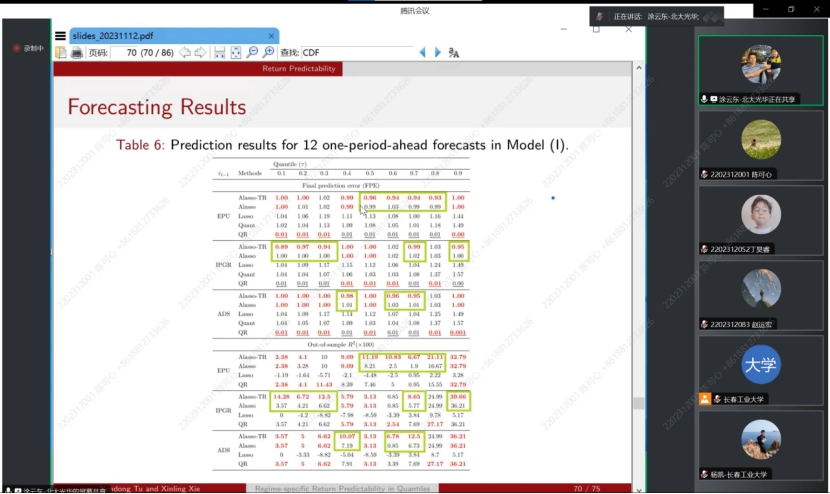 本次学术交流会拓展了同学们的学术视野,也激发了同学们的学习热情,更加努力学习研究新的领域与方法,并使老师和同学们对分位数回归预测、自适应Lasso等方面有了更深的理解,聆听报告的师生均表示受益匪浅。