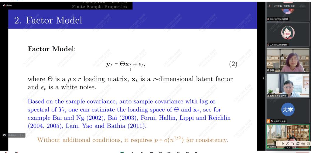报告会中,张教授主要介绍了HD时间序列的高维稀疏因子模型。在现实中广泛存在高维时间序列数据,因此张教授主要介绍了公因子模型。为了更直观的方便于理解,张教授又详细的介绍了公因子模型,其实就类似于将p维数据投映到了r个方向。除此之外,张教授还讲到了关于降为常用到的稀疏模型。