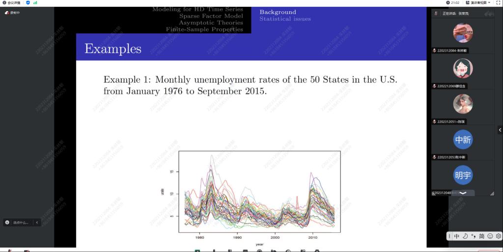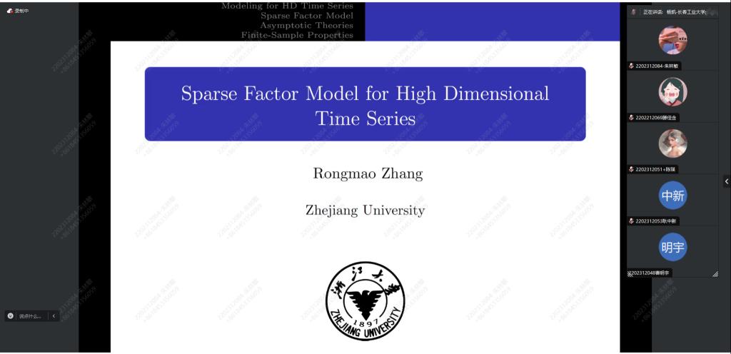 张教授通过细致又准确的讲解,使得同学们对高维时间序列分析方向有了更深的了解。报告会后,老师和同学表达了对该方向浓厚的兴趣,也提出了很多相关疑问,张教授也对我们的疑问做了解答。通过此次报告会,提高了同学们对时间序列方向的认识,让同学们大受启发。