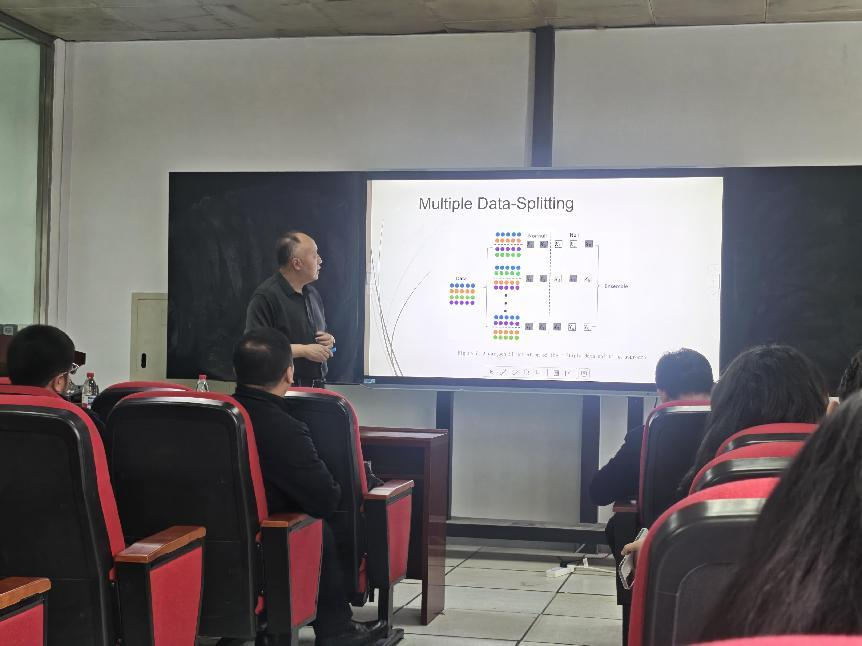 在报告中,刘教授为同学们系统阐述了无p值特征选择领域的最新研究成果,重点探讨了如何利用先验信息或协变量选择最优镜像统计量这一关键问题,并提出了创新性的解决方案。本研究构建了新型镜像统计量并推导出最优形式,理论证明其在弱信号场景下的优势。针对传统均等分割的不足,创新性提出了基于自我参照原则的数据分割(ADS)方法,通过优化分割比例显著提升特征选择效果。理论和实验均证实ADS的优越性,为高维数据分析和先验信息整合提供了新思路。