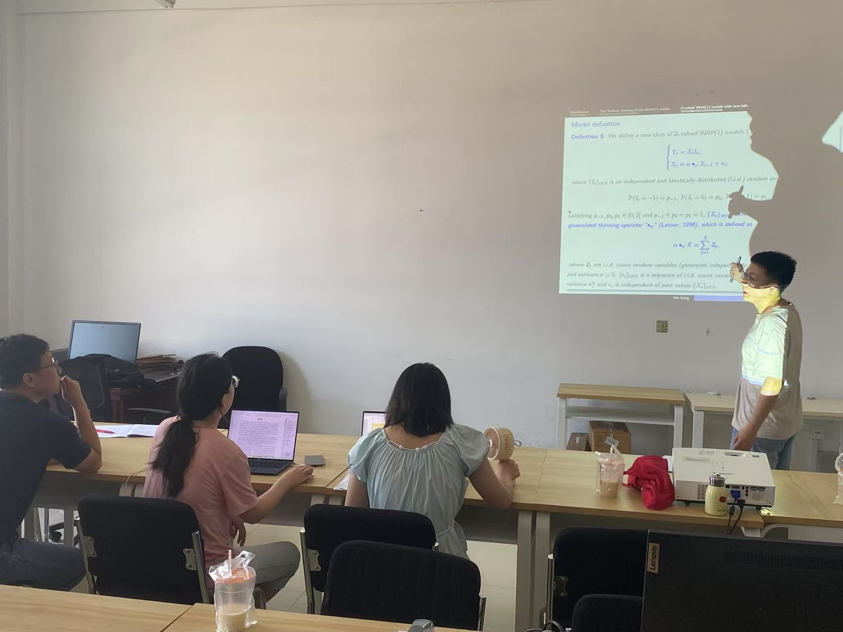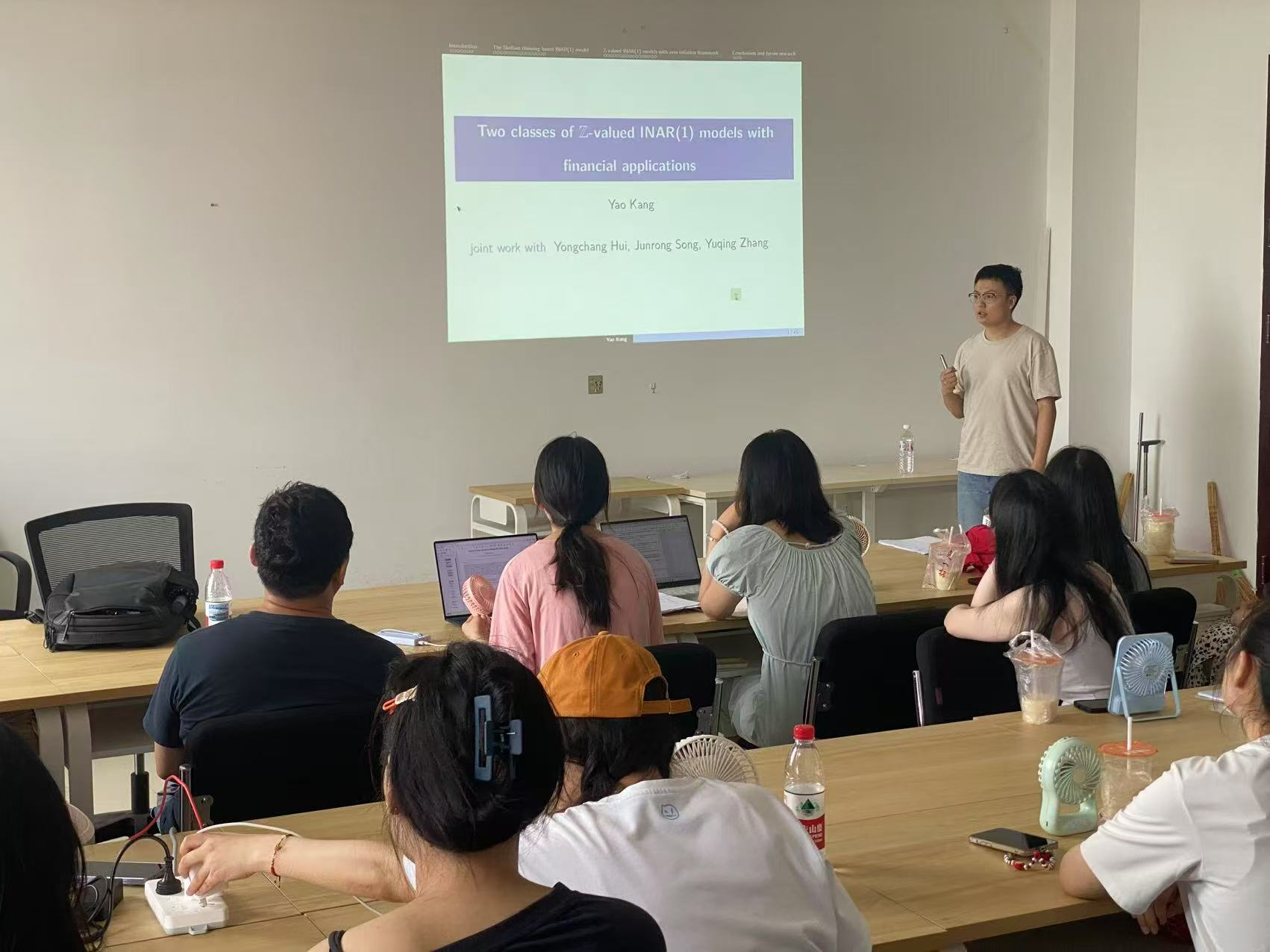 报告会中,康老师主要介绍了两类整数值自回归时间序列模型。首先说明了这两类模型建模想法的来源并对两类稀疏算子(二项系数算子、广义幂级数系数算子)进行了介绍。其中利用零膨胀泊松分布构造第二个模型,并利用开放式共同基金数据作为moxin的实例数据进行分析。还利用矩估计,条件最小二乘,条件极大似然对模型的参数进行估计,模拟研究发现条件条件极大似然估计参数的效果在三个方法中是最优的。此外报告还介绍了模型的统计推断,并对模型进行了拟似然估计。最后康副教授对论文的不足进行了分析改进,并对未来研究的内容做了展望。