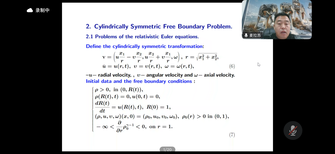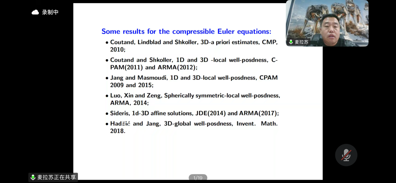其次,麦教授对阻尼系统的背景解寻找方法进行了解释:纯欧拉系统可通过变换得到,而带有阻尼的系统则具有明确的背景解结构。同时,麦教授也介绍了团队目前正在研究的问题:从一维、球对称、γ=2的情况扩展至一维、球对称、任意γ>1的一般情况。此外,涵盖了无阻尼的相对论欧拉方程以及带阻尼的欧拉-Poisson方程等模型。