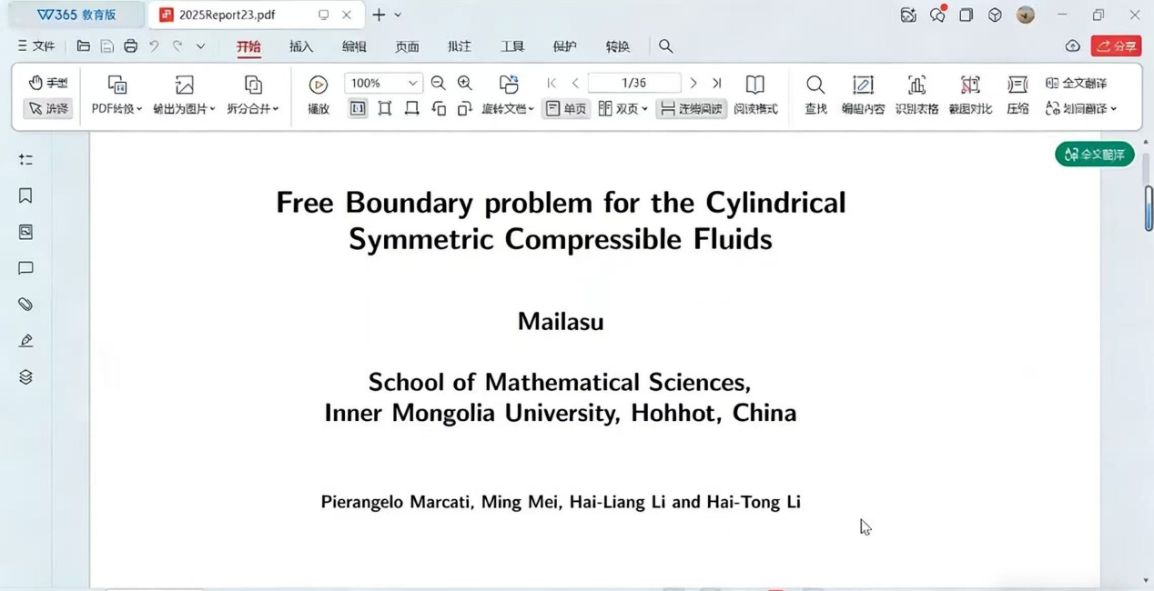 会议开始之际,麦教授汇报了其研究成果,同学们认真聆听,受益匪浅。麦拉苏汇报了其团队在变阻尼欧拉方程领域的研究进展,涵盖了阻尼情况下的解的存在性与先验估计问题。研究主要采用拉格朗日变换,将问题退化至初始区域,以解决原点处奇性和问题边界处的困难。并应用了广义的哈迪不等式,以处理奇异性并建立合适的加权能量估计。研究已成功解决圆柱对称情形下,γ=2的情况,并计划将其推广至一般情况和球对称情形。相关方法已成功应用于双曲抛物耦合系统以及多种其他物理模型的研究。