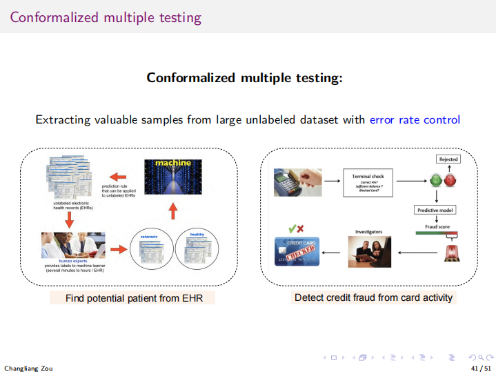 最后,邹教授将研究视角从区间估计转向假设检验,探讨了共形化多重检验方法。通过在数据驱动子集内构造共形p值,并结合BH过程,实现了对子群体内错误发现率的控制。该方法在子群发现、公平性评估等任务中具有广泛适用性。