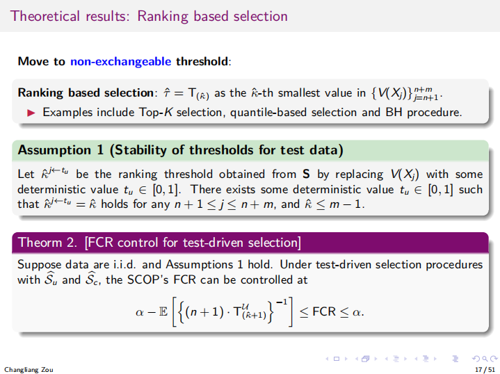 然后,邹教授回顾了共形预测的基本思想与选择性推断的相关文献,指出现有方法在处理选择偏差时的局限性。随后,邹教授指出了SCOP(选择性条件共形预测)方法的优越性。该方法通过构建与选择规则一致的校准集,实现了对选定个体的条件覆盖控制,并在理论上证明了其在有限样本下的FCR控制能力。SCOP不仅适用于固定阈值选择,还能扩展到基于排序或测试驱动阈值的选择规则。