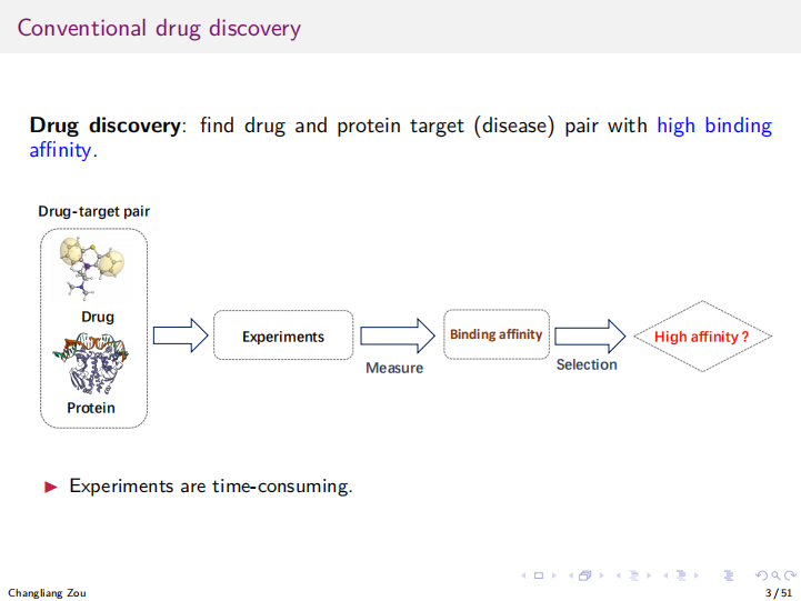 报告伊始,邹教授首先为我们介绍了一个实际的问题。在药物研发领域,科学家们面临着一个关键挑战:如何从成千上万的药物-靶点对中,快速准确地筛选出具有高结合亲和力的候选药物?传统的实验方法耗时耗力,而机器学习辅助方法虽然能够快速预测亲和力,但预测值与真实值之间存在差异,这种不确定性可能误导后续研究。因此,邹教授及其团队在共性预测方面进行了一系列的研究,