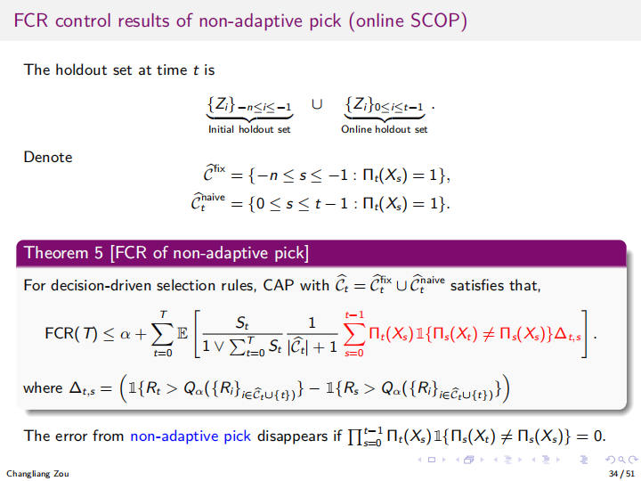 进一步,邹教授及其团队将问题拓展至在线学习场景,提出了CAP(自适应挑选后校准)算法。该算法能够应对数据流式到达、选择规则随时间变化的情况,通过自适应地挑选历史数据作为校准集,确保在线选择过程中的FCR控制在预设水平以下。并且,CAP算法不依赖数据分布假设,具有理论上的有限样本保证。