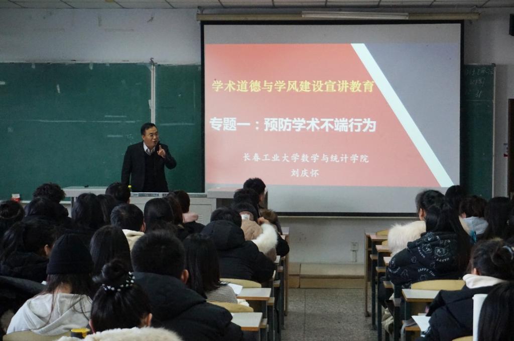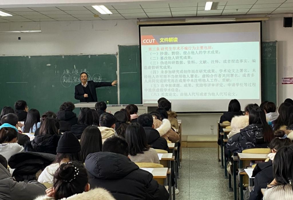 报告会上,刘庆怀老师首先严肃指出近五年学校科研学习违纪情况,为同学们分析违纪原因并解读违纪的严重后果,并说明研究生学术不端行为主要包括:抄袭、剽窃、侵占他人的学术成果;篡改他人研究成果;伪造科研数据、资料、文献、注释,或者捏造事实、编造虚假研究成果等。接着为同学们解读《学位论文作假行为处理办法》、《高等学校预防与处理学术不端行为办法》等文件,刘庆怀老师强调,“学术不端的本质就是弄虚作假,不劳而获,是一种败坏学术风气的行为,同学们要牢记和践行社会主义核心价值观,从自身做起,坚决杜绝学术不端行为。”