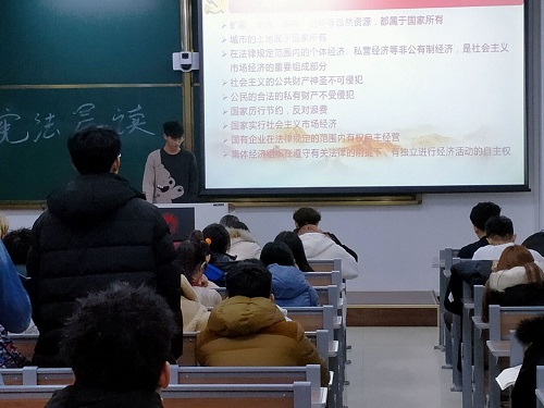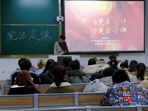 活动伊始,朱爱成详细介绍了宪法的发展历程:宪法的颁布、修订及意义。随后带领同学们诵读了宪法总纲,并通过观看视频带领学生了解更多关于宪法的知识。在诵读环节中,同学们充分感受了宪法作为国家根本大法的执行力度和法律效力,增强了学生宪法理念和法治精神,培养了同学们对宪法的认识,自觉遵守并维护宪法权威。学习活动结束后,同学们深刻地体会到在以后的学习生活中,要不断学习法律知识,提高自身法律素养与法律意识,做一个知法、懂法、守法、用法的新时代好青年。