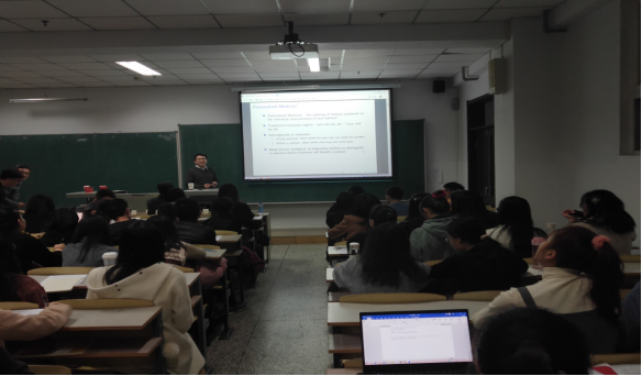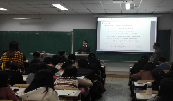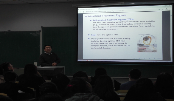 在报告会中,朱文圣教授以“Concordance Matched Learning for EstimatingOptimal Individualized Treatment Regimes”为题,以诙谐幽默的语言向我们讲述了一致性匹配学习估计最佳的个体治疗方案。提出了新的具有建设性开创性的观点。整场报告深入浅出、旁征博引,实例鲜活,诙谐幽默,引起了与会师生们的热烈反响。