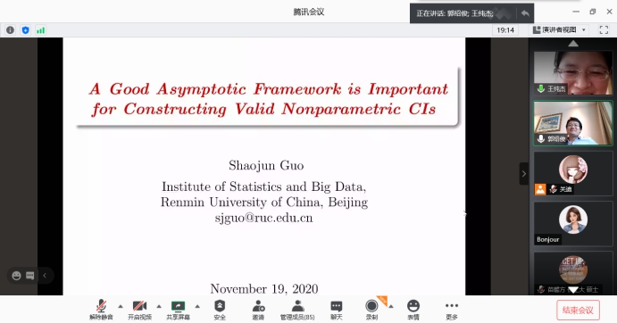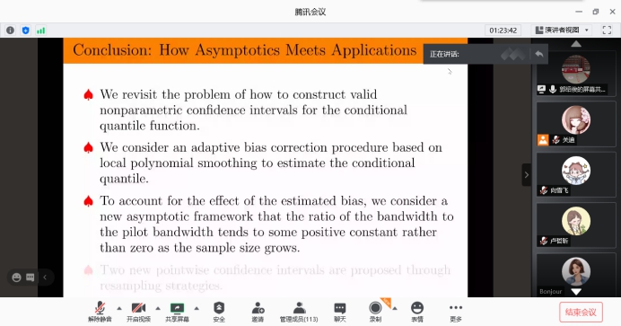 报告会中,郭绍俊教授介绍了如何从优化的角度为条件分位数函数构造更好的非参数置信区间的问题,讲解应用基于局部多项式平滑的全数据驱动偏差校正程序来估计条件分位数,在理论结果的基础上,通过重采样策略构造了两个新的点态置信区间。