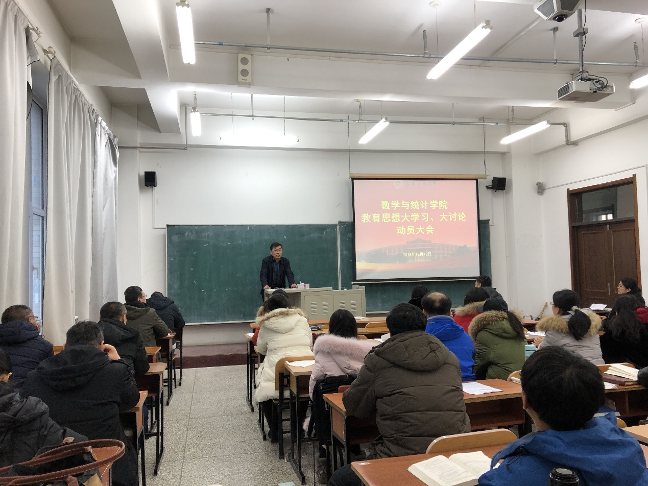 12月12日,beat365在线唯一官网登录在教学图书楼704教室召开“教育思想大学习、大讨论”动员会。副校长张明耀、研究生院长林洁琼、学院全体教师参加了会议。会议由学院党委书记朱宏伟主持。