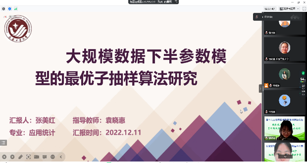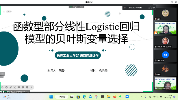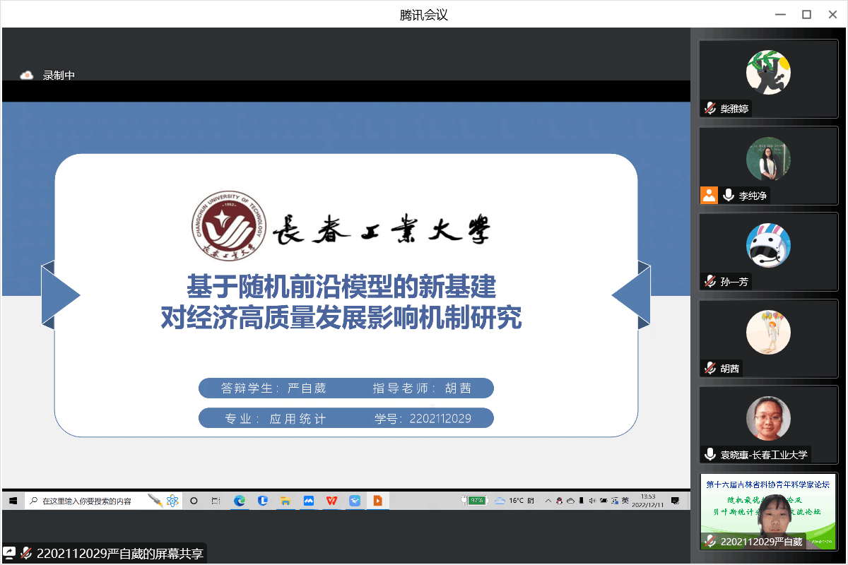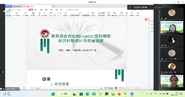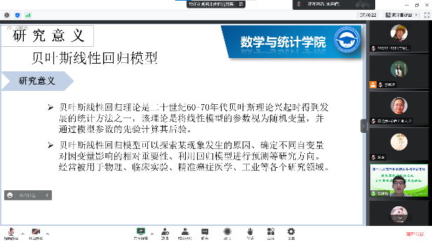 【通讯员 胡茜】20221211日,上午9:30,由吉林省工业与应用数学学会主办,beat365在线唯一官网登录协办的第十六届吉林省科协青年科学家论坛-随机最优控制及贝叶斯统计分析析学术交流论坛”在腾讯会议线上举行。主论坛特别邀请吉林省工业与应用数学学会李勇理事长、东北师范大学郑术蓉教授、吉林大学韩月才教授、吉林大学辛本禄教授、暨南大学王国长教授、北华大学谭希丽教授、吉林大学李天宇副教授、西安交通大学付利亚副教授、闽南师范大学吕阳阳老师、北华大学张继超老师。本次论坛由学院副院长李纯净主持,学院院长王纯杰、统计系主任杨凯、统计系党支部书记袁晓惠、统计系教师孙一芳、李贺宇、胡茜以及部分研究生参加了本次线上青年科学家论坛。