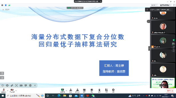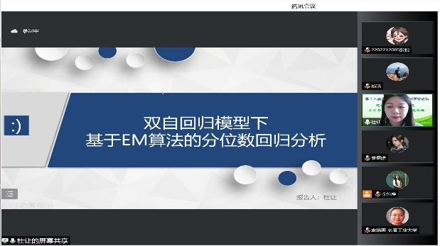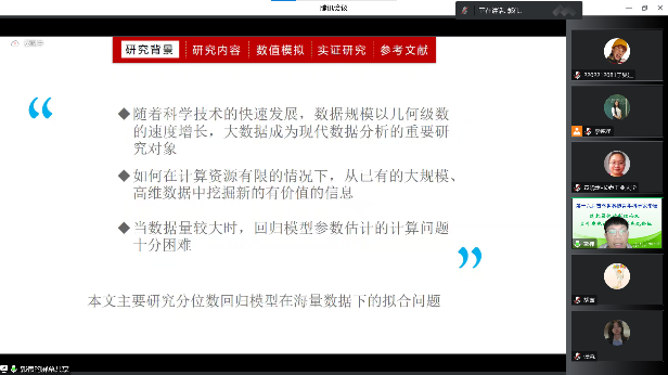 主论坛上,李勇理事长代表学会对论坛的举办表示由衷祝贺,高度评价了beat365在线唯一官网登录近年来快速发展的良好态势,表达了学会对本次论坛的大力支持和高度重视。在各位青年学者进行汇报之前,各位专家开展了热烈讨论交流并进行云合影。分论坛共邀请了23位青年学者进行学术报告,报告分为3个专题,汇报的研究方向有函数型数据研究、贝叶斯统计分析、其他模型与算法的研究等。青年学者积极开展学术报告,各位与会专家、学院院长王纯杰和统计系主任杨凯分别为青年学者进行点评。