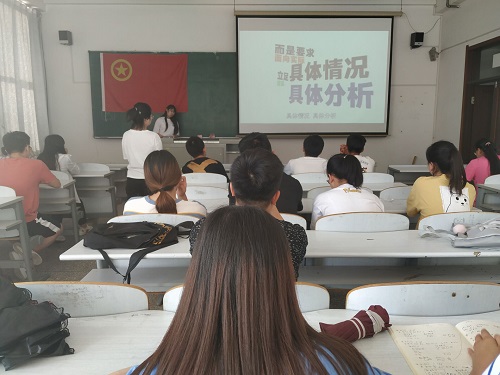 学习会上,刘芙蓉讲到,党的十九大中提出“推动马克思主义中国化时代化大众化,建设具有强大凝聚力和引领力的社会主义意识形态”的概念,这是一项长期且艰巨的战略任务。马克思主义是随着实践的发展而发展的,其生命力在于不断的创新发展。刘芙蓉通过播放相关视频,号召同学们,作为青年一代应当致力于马克思中国化时代化大众化的研究,更好地坚持和运用马克思主义的立场、观点、方法来分析解决实践问题。