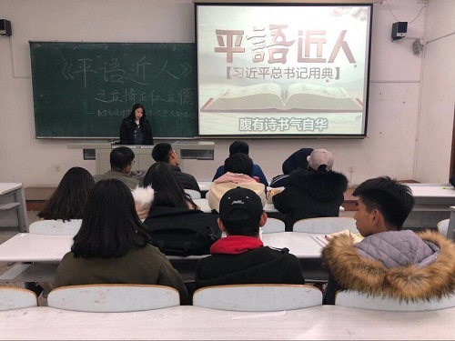 在学习会上,林思扬向同学们简明扼要地介绍了《平“语”近人》节目的思想。从立情方面而言,要坚持以人民为中心的发展思想,这是习近平总书记情到深处、自然而然的一种思想流露,同时它也充分地体现了习近平新时代中国特色社会主义思想。在“为民”这个大的主题之下,习近平总书记身体力行、切实为百姓做实事。谈到立德,她从崇德,明德,修德三个点通俗易懂的解释习总书记的思想,是对我国道德思想的继承和发展。今天,同学们处在一个新的伟大时代,中华民族也迎来了重大的历史机遇期。我们的青年要上进,我们的党要上进,我们的国家、民族要上进,那就必须大兴学习之风,用扎扎实实的学习来为实现中华民族伟大复兴中国梦铺就一条扎扎实实的前进之路。最后,她鼓励并希望同学们应该找准自己的目标,坚定的朝着目标前进,在人生的道路上,树立正确的价值观、世界观、人生观。